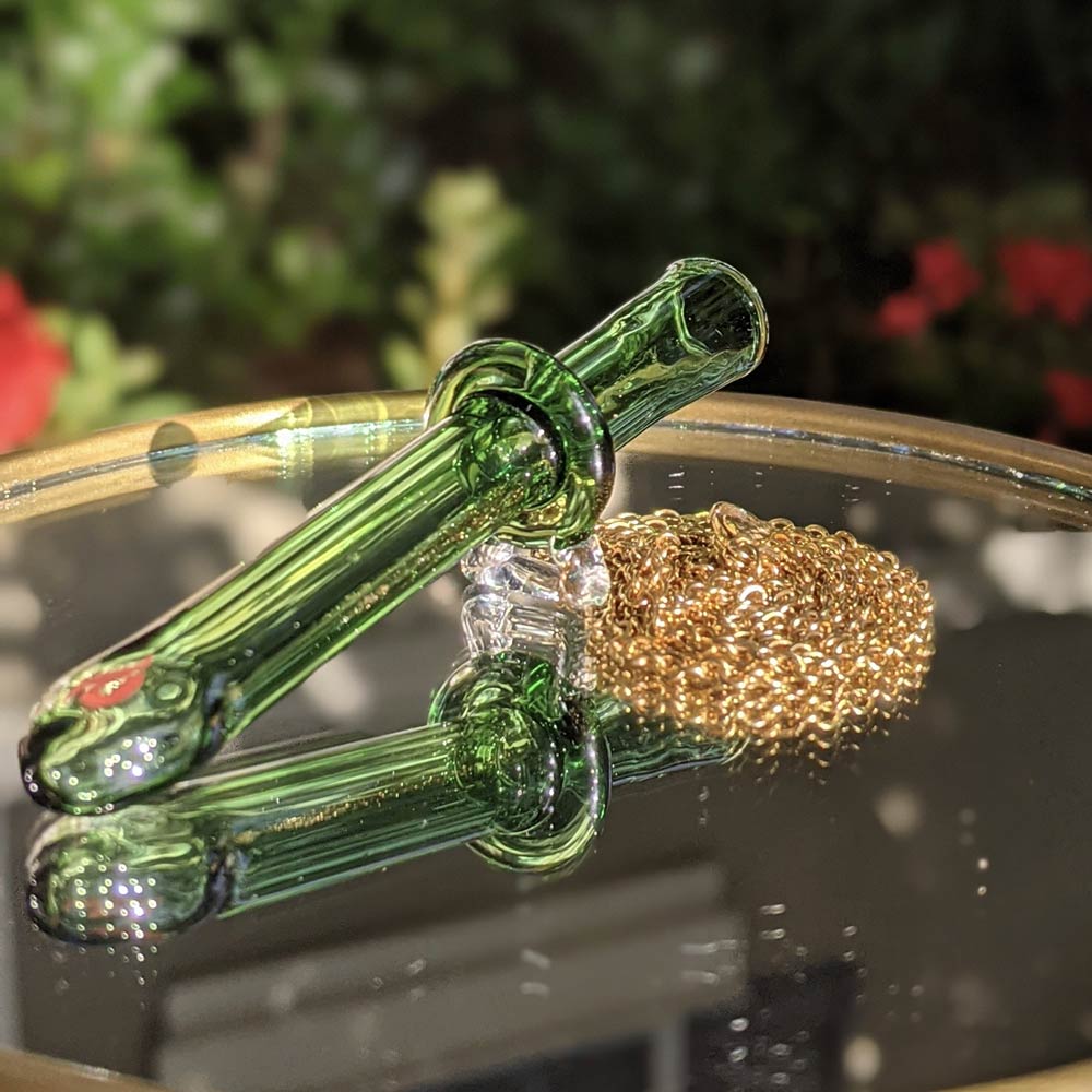 A luxury handblown smoking accessory. Imagine a fancy glass hookah tip, but for all your other portable smoking pleasures. It can be worn as a pendant or tucked away. Pass the J not the germs by sharing responsibly.